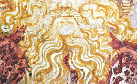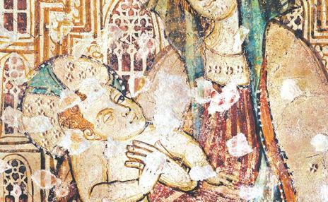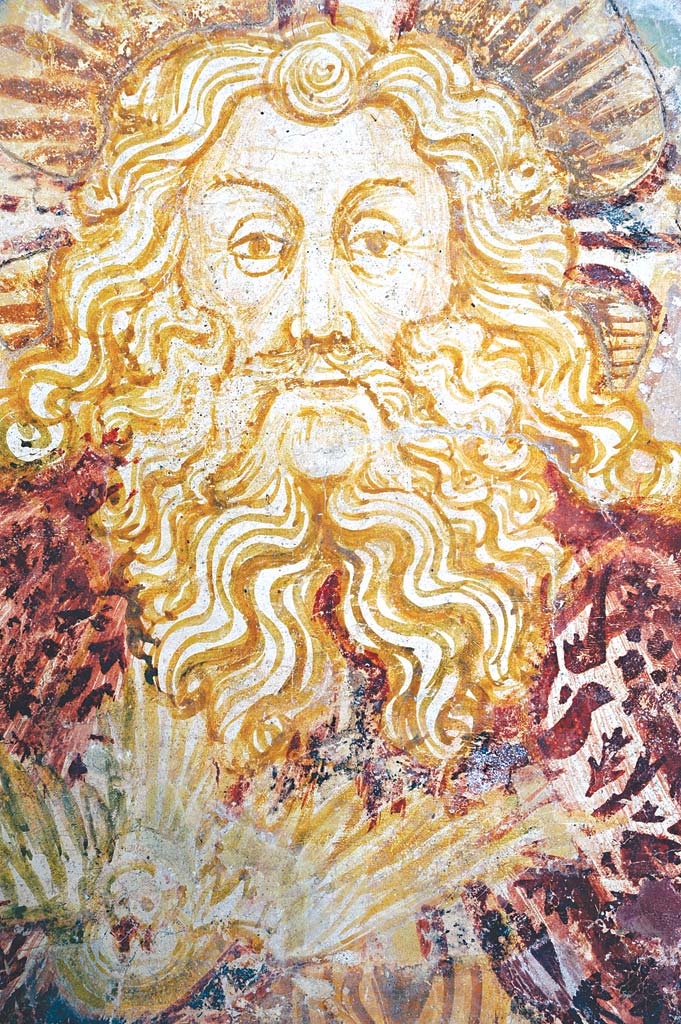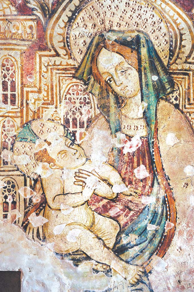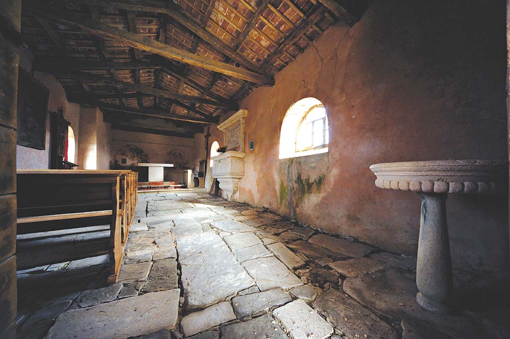 From the outside, the church has a simple form with a bell gable for three bells and a portico with a closed northern and southern wall as protection from the wind. Inside, in the sanctuary, there were two inscribed apses that were later removed. This typology is the characteristic feature of Istria, which will be mentioned again later. The frescoes have been preserved only on the eastern wall so that the imprint of the form of the removed apse can still be seen. However, more important is the cultural and historic importance of the preserved frescoes. They were painted by Albert from Constance, a town in south Germany lying on Boden Lake. Constance is known for its significant church council in the beginning of the 15th c. It was the time when the so-called soft Gothic was dominant in the Alpine region. It was a style formed on the bases of international Gothic that is also reflected in Albert’s works. On the place of the left removed apse is the Virgin and Child on a richly carved, airy lace-like, Gothic throne. The veil on her head is folded in the play of folds, forming an impressive volume. Right to the scene is the one where God the Father is seated on the throne holding crucified Christ in his hands, known as the Throne of Mercy. Among them is the dove of the Holy Spirit that completes this specific representation of the Holy Trinity. Albert’s continental component is his graphism that we will remember looking at the drawing of hair and beard of God the Father.