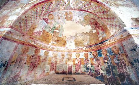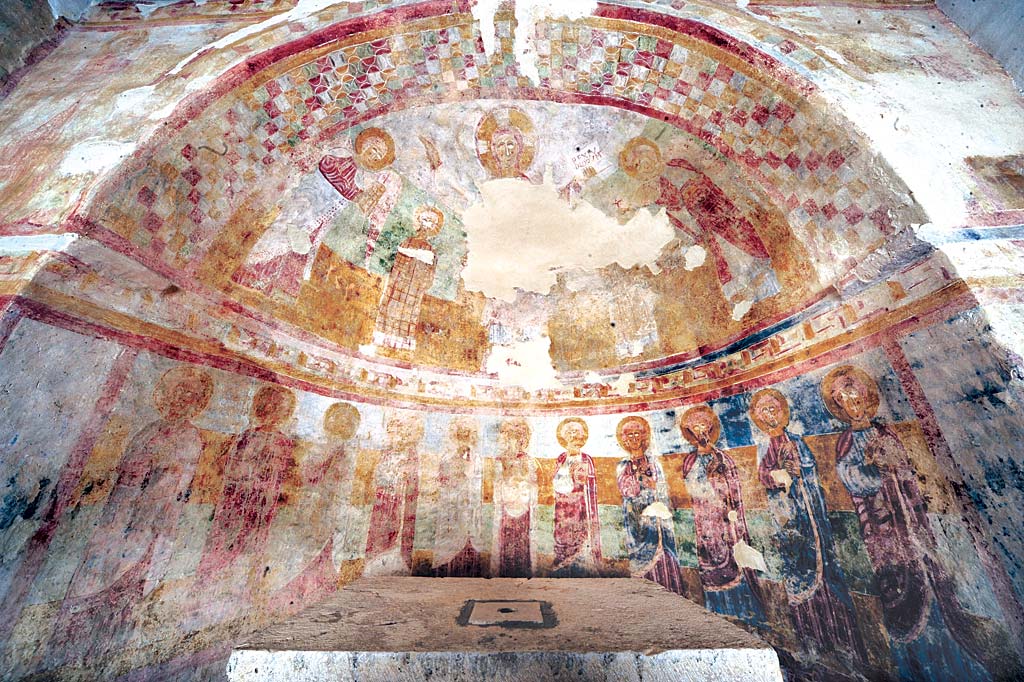 In the lower register of the center of the apse is an image of the Virgin Mary in the Orans position flanked by five Apostles on each side. The number of Apostles suggests that the two missing in the composition should be found in the conch of the apse. Christ is represented as a young beardless man holding an unusual inscription in capitals: REX IUDEORUM. On the triumphal arch the customary scene of the Annunciation is replaced by the scene of Cain and Abel's Offering. St. Agatha and St. Lucy are depicted in the fields under the triumphal arch. Geometrical bordures repeat the ornamental repertoire characteristic of Carolingian painting.