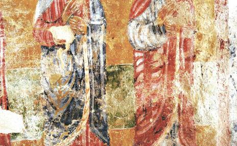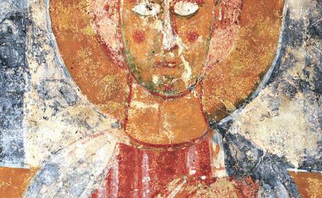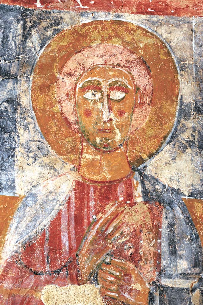 The division of the wall surface behind the Apostles and the use of bordures highlight the horizontals. The scenes are basically ornamental. The Apostles are depicted in simple, hieratic postures, the static quality of the composition being underlined by the color alternations of their garments. It is somewhat interrupted only by the scene of Christ with his hands wide open in the conch of the apse, as well as Apostles presenting gifts. Such composition emphasizes the central scene of this iconographic program. By using a limited palette, the painter achieves interesting colorist accords. Faces and hands are shaped by the complementary contrast of green and red. All the colors were painted onto a layer of fresh, wet plaster (a fresco) except for the white pigment. The white color was used for lumeggiature and inscriptions above the Apostles. In the course of time the color fell off from the wall, so that it is merely visible today. The eyes of the Apostles have been scratched off, which is not an act of vandalism but the belief of ignorant people that they would cure eye disease with the scratched off powder. However, we truly hope that it did not end up in their eyes, but instead they drank it up. This church was famous for something else. Nursing mothers whose milk had dried up would make a pilgrimage to St. Agatha's Church, since among all the barbarities St. Agatha was subjected, was the cutting off of her breasts.