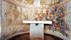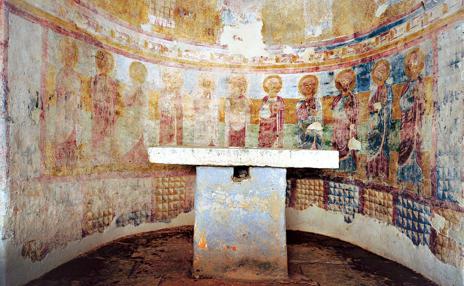 U donjem registru u sredini apside stojeći lik Bogorodice s rukama uzdignutim u molitvu okružen je sa svake strane petoricom apostola. Broj apostola nas navodi na to da u konhi apside prepoznamo dvojicu koji u donjoj sceni nedostaju. Krist je prikazan kao golobradi mladić koji u ruci drži neuobičajeni natpis: REX IUDEORUM. Na trijumfalnom luku žrtva Kainova i Abelova zamjenjuje uobičajeni prikaz Navještenja. Svetice Agata i Lucija nalaze se u poljima ispod trijumfalnog luka. Bordure s geometrijskim motivima ponavljaju ornamentalni repertoar poznat iz karolinškog slikarstva.