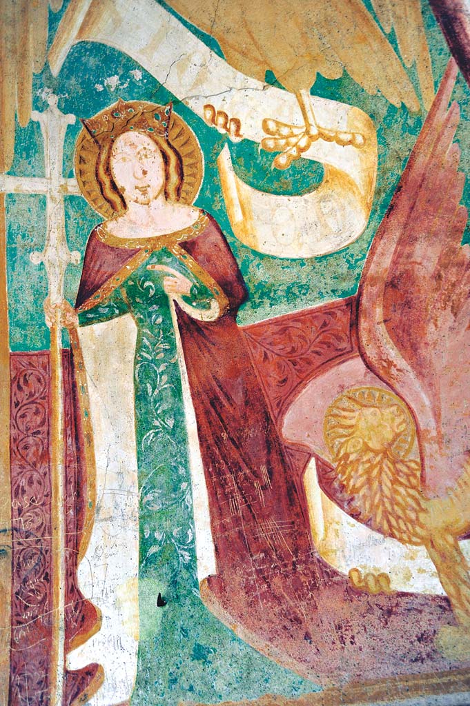 V nekoč v celoti poslikane cerkve sv. Helene so se ohranile le freske Oznanjenja na slavoloku, a na temenu apside Kristus v mandorli, obdan s simboli štirih evangelistov in okroglim medaljonom z vstalim jagnjetom. Na njegovi levi je sv. Helena, na desni pa najverjetneje sv. Nazarij, koprski škof.