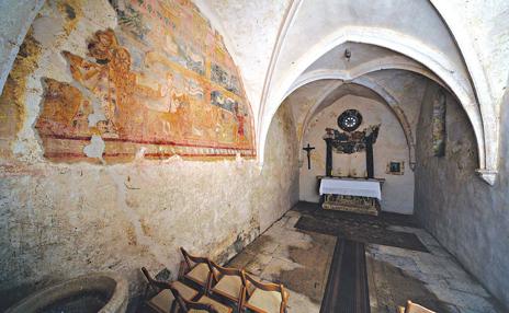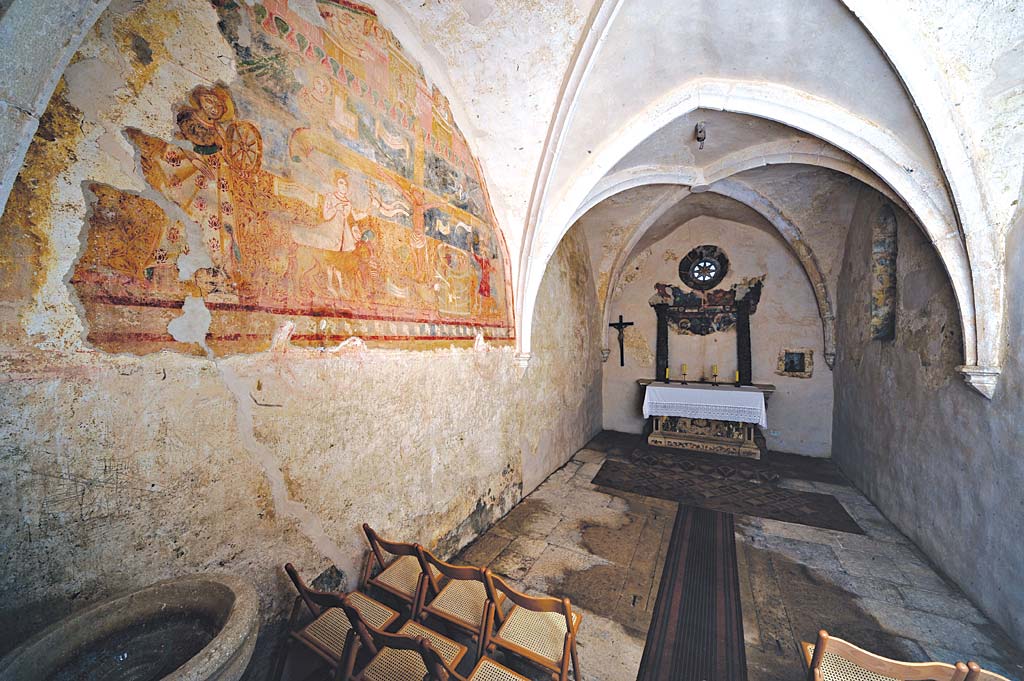 Bolj znane freske se nahajajo v gotski cerkvi sv. Katarine, skladni stavbi, kateri je dozidana lopica s polnimi stenami in tremi odprtinami. Okenska tranzena na začelju in notranja razdelitev na pole, ki so križno obokane, so arhitekturni elementi, ki kažejo na gotski nastanek. Do pred kratkim je edina odkrita freska bila Živi križ na severni steni prve pole. Datirana je z glagolskim napisom na enem od naslikanih zvitkov v leto 1409. Ostali zvitki so prav tako nosili glagolske napise, ki so obledeli do neberljivosti. Slika je razdeljena na dva dela z borduro stiliziranih oblakov. V zgornjem delu je alegorični prizor Nebeškega Jeruzalema z Bogom Očetom. V spodnjem delu prizora je Križanje transformirano tako, da se mu kraki podaljšujejo v štiri roke. Ena od njih z mečem prebada glavo alegorični upodobitvi sinagoge, ki jaha na oslu zavezanih oči, v eni roki drži kozlička in v drugi zlomljeno koplje z zastavico, na kateri je upodobljen škorpijon. S tem se želi poudariti ukinitev Stare zaveze. Novozavezna cerkev je okronana figura, ki kleči na simbolih štirih evangelistov, ena roka križa pa jo blagoslavlja. Zgornja roka odklepa vrata Nebeškega Jeruzalema blaženim dušam, a spodnja razbija vrata limba, medtem ko se hudiči upirajo in jih obstreljujejo s pušicami iz loka. Na prizoru sta upodobljeni še dve simbolični figuri. Angel z orglami simbolizira harmonijo, medtem ko je neskladje prikazano kot hudič, ki trobi v dve trobenti in spušča vetrove pod kozjim repom. V levem delu kompozicije je figura zavetnice cerkve, sv. Katarine, ki drži zlomljeno kolo, atribut njenega mučeništva.