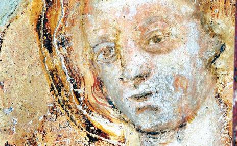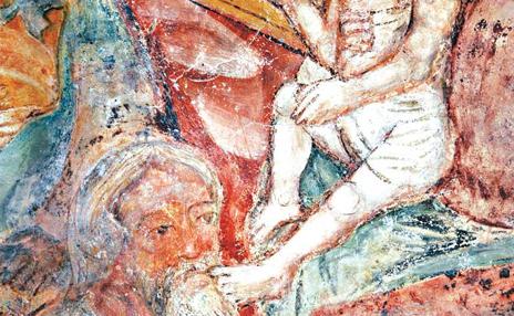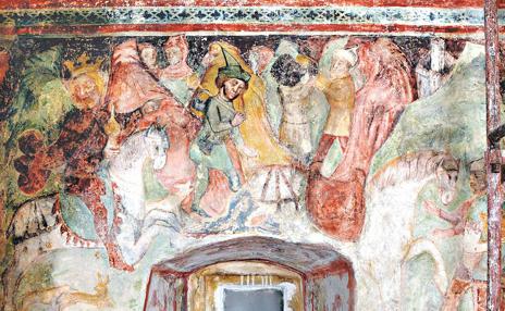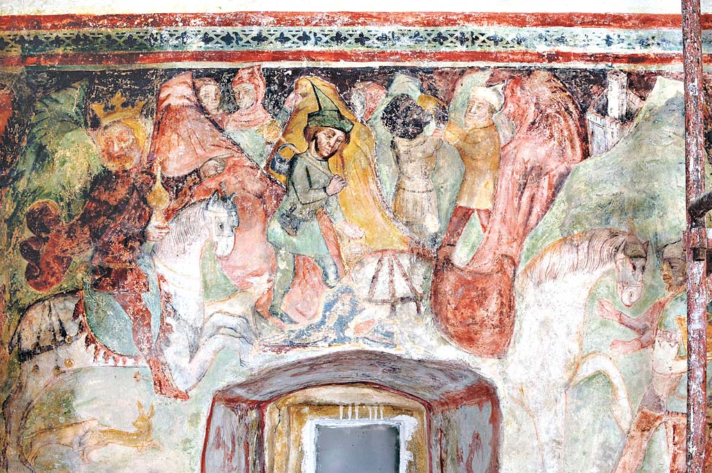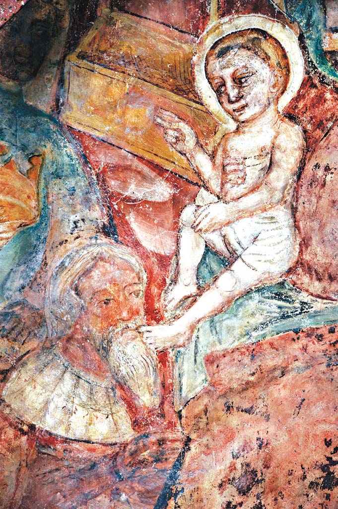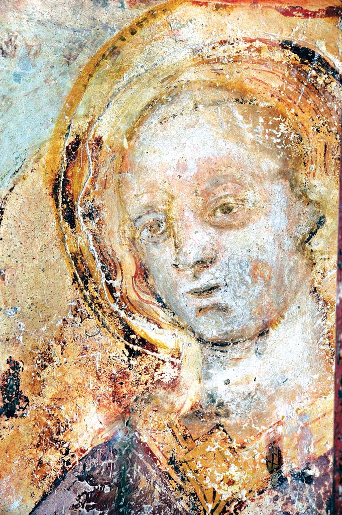 Cerkveno notranjost so dokončali trije slikarji. Niso poslikane vse stene, temveč samo prezbiterij, kar je običajna praksa v lokalnem srednjeveškem stenskem slikarstvu. Na najstarejšem neposlikanem ometu se nahajajo posvetilni križi, grafit ladje in napis z gotskimi latinskimi črkami v hrvaščini Stara baba Wchosa, ki je vpraskan v sveži omet. Na severni steni po atributu ključa prepoznamo sv. Petra zraven pa še enega apostola, ki ga odkrivamo po knjigi. Na žalost glave niso ohranjene, oblikovanje draperije in rok pa govori o kvalitetnem slikarstvu v tradiciji trecenta. Ostale prizore je naredil drug slikar. Poklon kraljev zavzema največji del vzhodne stene. V arkadah pod njo je vrsta svetnikov, med katerimi, pod oknom, dva angela držita Veronikin prt. Te gotske freske so slabo raziskane, po koloritu, ornamentih, detajlih obraza in draperije pa so najbolj podobne stenskim slikam v cerkvi sv. Antona v Barbanu. Na južni steni je v pripravljalni risbi skiciral Oznanjenje. Prizor Kristusovega polaganja v grob v luneti prezbiterija je povezan z delovanjem mojstra Dominika iz Vidma. Njegova delavnica je poleg sv. Marije v Gračišću poslikala številne druge istrske cerkve in je zato Dominik, ob lokalnem slikarju Antonu iz Padove, najplodnejši slikar 16. stoletja. Srečali ga bomo tudi v bližnjem Lindarju.