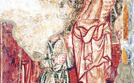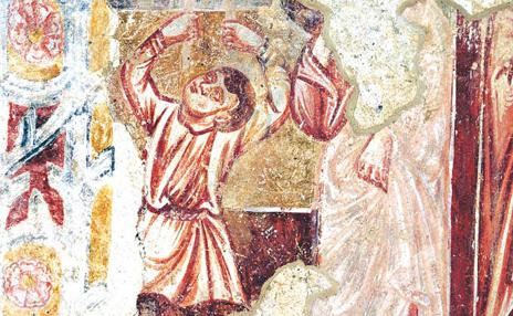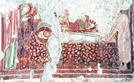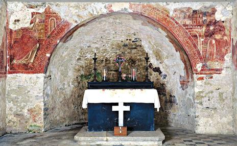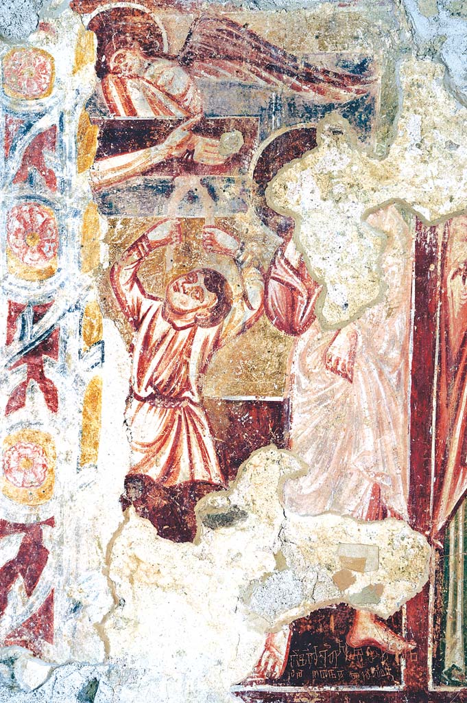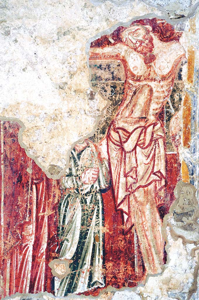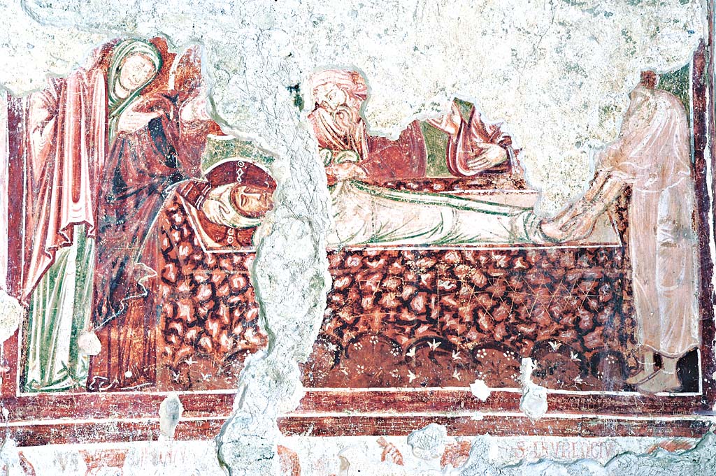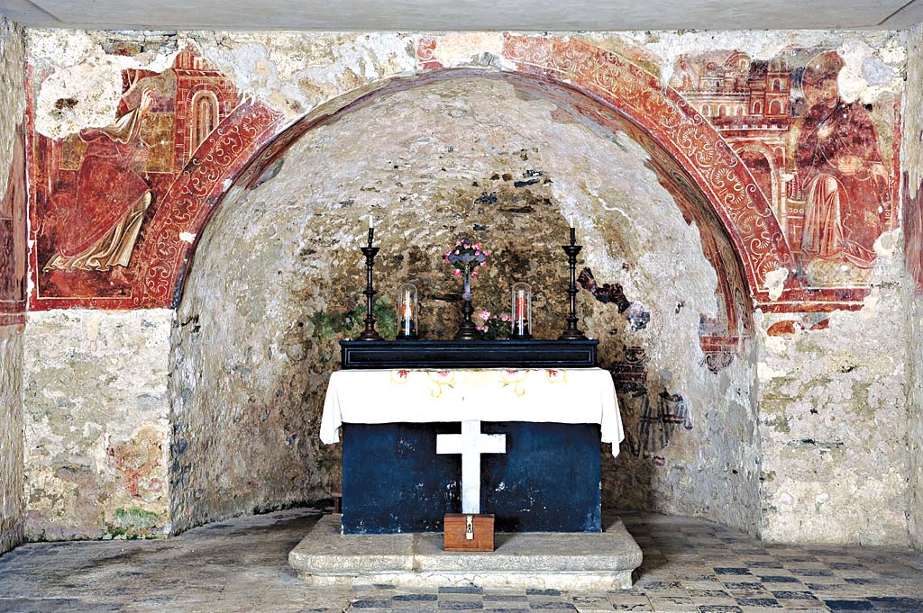 Njena notranjost skriva dragocene freske iz konca 12. ali začetka 13. stoletja. Na slavoloku je prizor Oznanjenja, postavljen pred neko mestno arhitekturo. Angel je v gibanju, z vihravo draperijo, Devica Marija pa sedi na prestolu in prede volno. To je apokrifni motiv iz Jakobovega protoevangelija, priljubljen na krščanskem Vzhodu. Najlepši prizori so Snemanje s križa in Polaganje v grob na severni steni. Na njih je opaziti mojstrstvo slikarja. Da se vam v spomin vtisne posebnost tega slikarstva, ostanite trenutek dlje pred figuro sv. Arimateja in njegovimi plemenitimi starčevskimi potezami ter draperijo skrajno leve figure. Občutek plastičnosti je dosežen z dosledno izmenjavo svetlih in temnih potez barve, s katerimi so oblikovane gube na oblačilih figur. Skrajni robovi oblačil so poudarjeni s svetlimi konturami, lumeggiaturami, detajli arhitekture pa z belo barvo. Do sedaj je bila izpostavljena bizantinskost kot dominantna komponenta tega slikarstva. Novejše raziskave pa so to slikarstvo umestile kot vezni člen med beneško – oglejskim in avstrijsko – salzburškim slikarskim krogom. Še vedno odmevajo Fučićeve misli, da izjemna kvaliteta te poslikave prekaša možnosti okolja in lokalnih naročnikov, zato je naročnik verjetno bila Oglejska patriarhija, največji fevdalni mogočnik tedanje Istre.