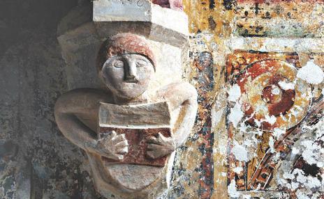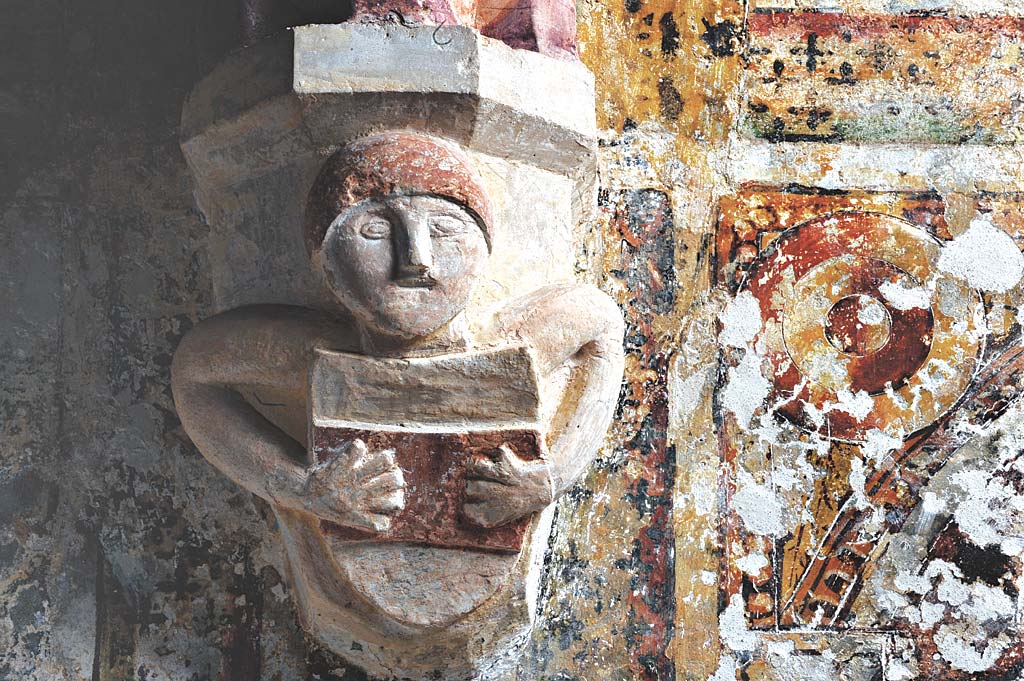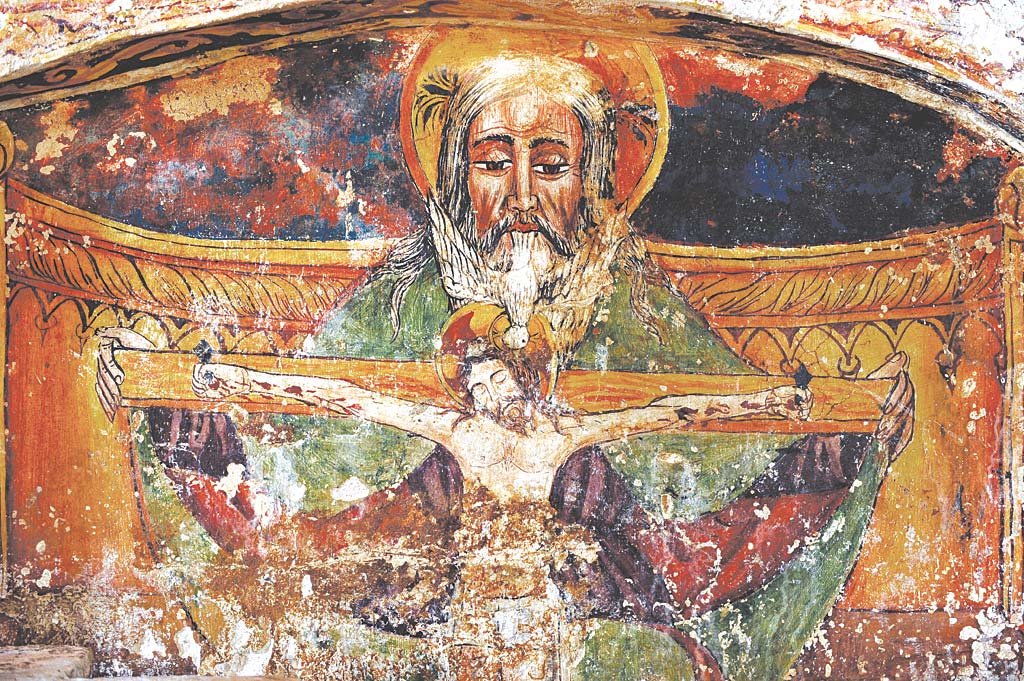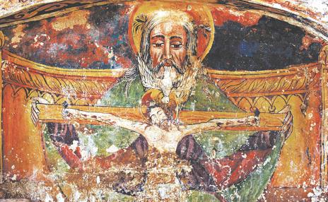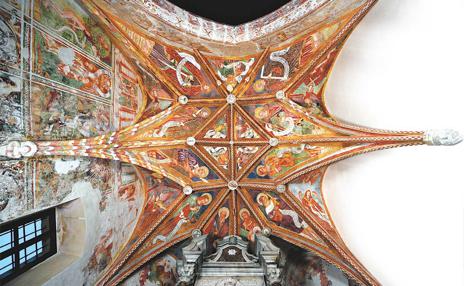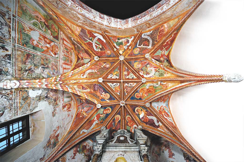 Za oltarjem je upodobljen Kristus kot vladar na prestolu. Na glavi ima krono, a v roki drži jabolko s križem, znamenje kraljevske oblasti. Vse te prizore dopolnjujejo številni preroki ter svetnice v okenskih špaletah. Na južni steni ladje je ohranjena freska, ki posnema oltarno palo. V sredini je Marija z otrokom obdana z angeli, ob straneh pa sv. Peter in Pavel. Pod tem prizorom je plitva niša, v kateri je upodobljen Prestol modrosti – na tronu sedi Bog Oče, ki v rokah drži sina, križanega Kristusa, med njima pa je golobica Svetega duha.