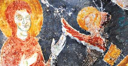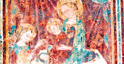 Sv. Katarina je tipološko zanimiva enoladijska kapelica z odprtim lesenim ostrešjem z vrisano apsido, ki je zaključena s šilastim obokom. Poslikana je s prizori iz življenja istoimenske svetnice. Njena zaroka je upodobljena na sredini južne stene. V središču prizora je Marija z otrokom, ki sedi na prestolu brez naslonjala, izza katerega trije angeli držijo zaveso. Katarina je podala roko...