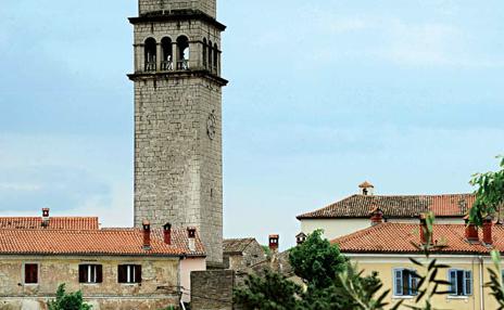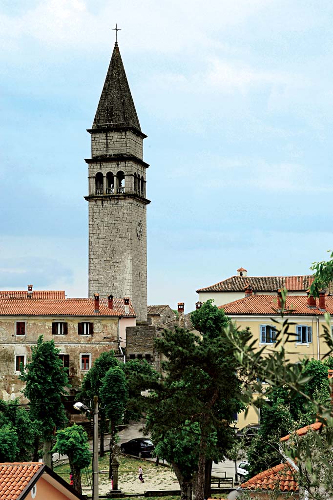 Zvonik, visok 48 m, je bil zgrajen ob koncu 19. stoletja in je med najvišjimi v Istri. Zraven njega je postavljena kamnita mera, s katero so nekoč pobirali desetino. Ohranjene so tudi dragocene orgle, številne relikvije, napisi in spomini iz bogatega obdobja škofovskega mesta.